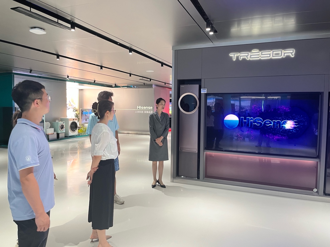实践团队首站抵达位于青岛的海信国际中心总部大厦,受到海信集团财务部高层的热情接待。在品牌展厅内,师生通过交互式沙盘与样机陈列,全景式回溯了海信从本土代工到全球布局的出海历程。在随后的座谈会中,企业方系统阐释了“技术立企、品牌先行”的国际化战略,特别分享在海外研发中心与体育营销上的投入如何反哺人才梯队。叶宁副书记则介绍了交大“扎根西部、服务国家”的传统,并就联合课题、实习基地等合作展开畅想,双方就产学研深度合作达成共识。