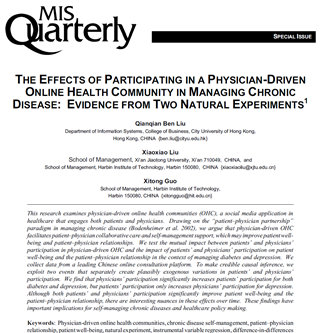 文章链接地址://misq.org/the-effects-of-participating-in-a-physician-driven-online-health-community-in-managing-chronic-disease-evidence-from-two-natural-experiments.html