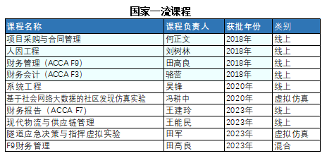 共有4门课程入选,分别是:王建玲教授负责的《财务报告(ACCA F7)》、王能民教授负责的《现代物流与供应链管理》入选国家级线上一流本科课程,田军教授负责的《隧道应急决策与指挥虚拟实验》入选国家级虚拟仿真实验教学一流本科课程,田高良教授负责的《财务管理(ACCA F9)》入选国家级线上线下混合式一流本科课程。