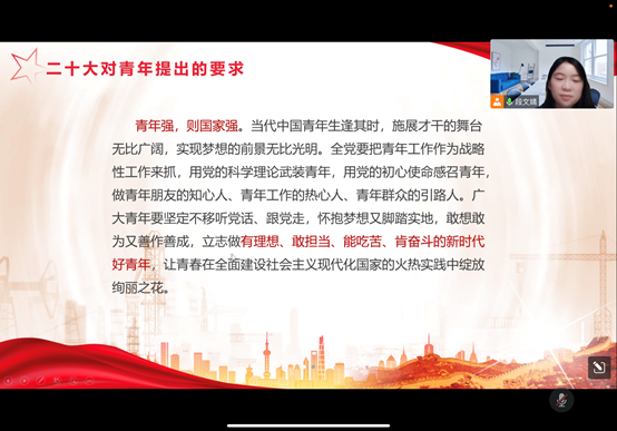 段文婧同志详细讲述了习近平总书记对广大青年提出的“立志做有理想、敢担当、能吃苦、肯奋斗的新时代好青年”的重要要求,并结合“西迁精神”的核心和精髓,呼吁同志们认真深入学思践悟,最大程度发展自己,彰显青春价值。
