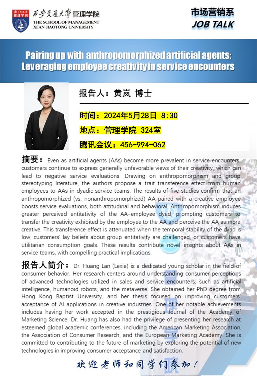 讲座:Pairing up with anthropomorphized artificial agents: Leveraging employee creativity in service encounters