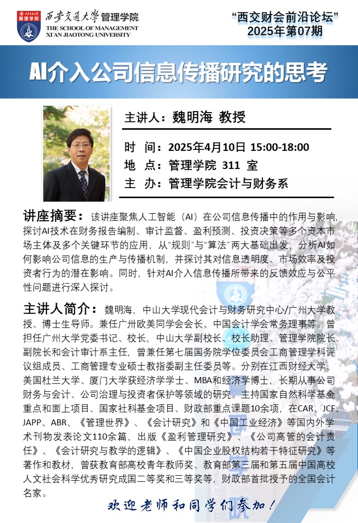 上一篇:管理科学与工程学会人工智能技术与管理应用分会 Workshop on AI for Management(WAIM) 暨AI赋能教学创新研讨会会议通知