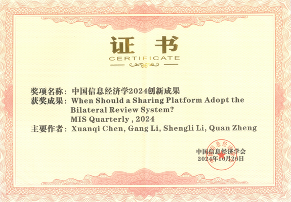 在国家自然科学基金项目(71832011、72372128)等资助下,李刚教授团队在共享平台评论系统领域取得进展,被国家自然科学基金委“资助成果”专栏专题报道//www.nsfc.gov.cn/publish/portal0/tab1202/info94248.htm。成果以“共享平台何时应采取双边评论系统(When Should a Sharing Platform Adopt the Bilateral Review System?)”为题,于2024年9月在《管理信息系统季刊》(MIS Quarterly)正式发表。论文链接://doi.org/10.25300/MISQ/2023/17596。2024年,该成果入选中国信息经济学会“中国信息经济学2024创新成果”。