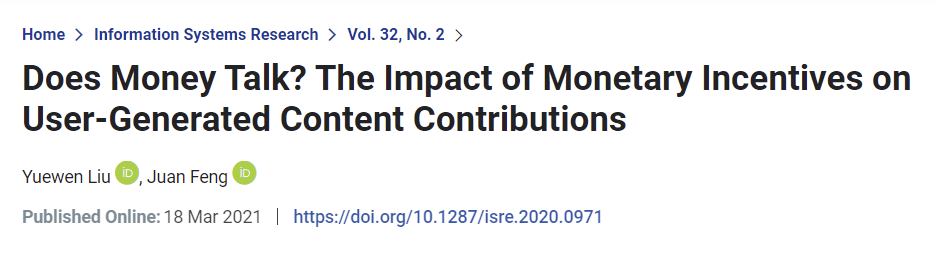 此项研究以《钱一定有用吗?经济激励对于用户生成内容贡献的影响》(Does Money Talk? The Impact of Monetary Incentives on User-Generated Content Contributions)为题,发表在管理信息系统领域顶级期刊《信息系统研究》(Information Systems Research)上。研究中提出的“双挤出效应”,为UGC经济激励的相关研究提供了一个坚实的理论基础,同时也为互联网平台从业者提供了较好的操作指引。