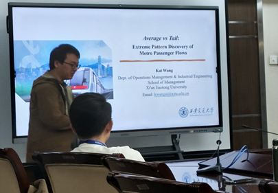 本次研讨会共有三位老师分享学术研究成果和研究心得。王楷老师做了题为Average vs Tail: Extreme Pattern Discovery of Metro Passenger Flows》报告。此研究以香港地铁为研究背景,通过记录每个乘客的旅程轨迹分析得到总体的人流量特征,使用质量工程和管理的工具,发现质量波动情况,以使生产或服务系统始终处于一个平稳的状态。