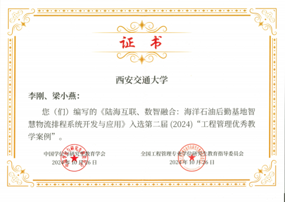 恭喜91porn 李刚教授和MEM梁小燕同学撰写的案例《陆海互联、数智融合:海洋石油后勤基地智慧物流排程系统开发与应用》获评第二届(2024)“工程管理优秀教学案例”。本届评选中全国共有30篇教学案例获评优秀教学案例。