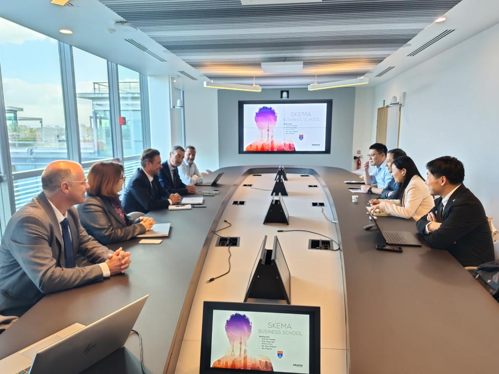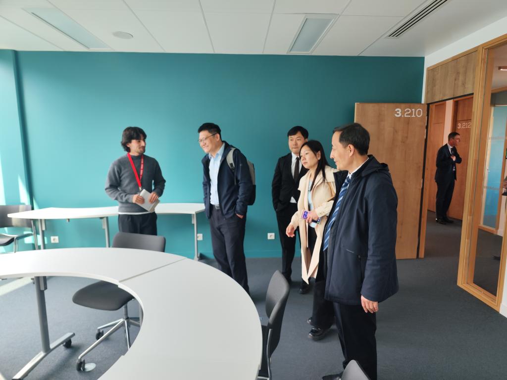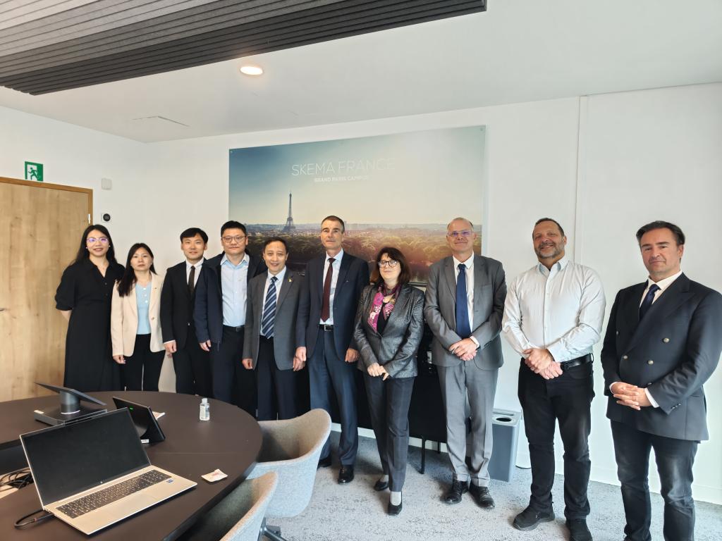 在法国SKEMA商学院巴黎校区,代表团与SKEMA商学院副校长Christophe Germain、Raluca Sandu,国际硕士项目负责人Christophe Dispas,SKEMA硕士项目主任Nicolas Servel6以及变革转型学院副院长Marcos Lima等进行了深入座谈交流。双方回顾了合作举办的创业与创新(大数据与人工智能管理)硕士项目的建设情况,并对未来的发展进行了展望。座谈中,双方就进一步深化在联合共建研究中心、合作举办国际会议、共同开展学术研究以及拓展新的教育合作项目等方面进行了深入研讨。