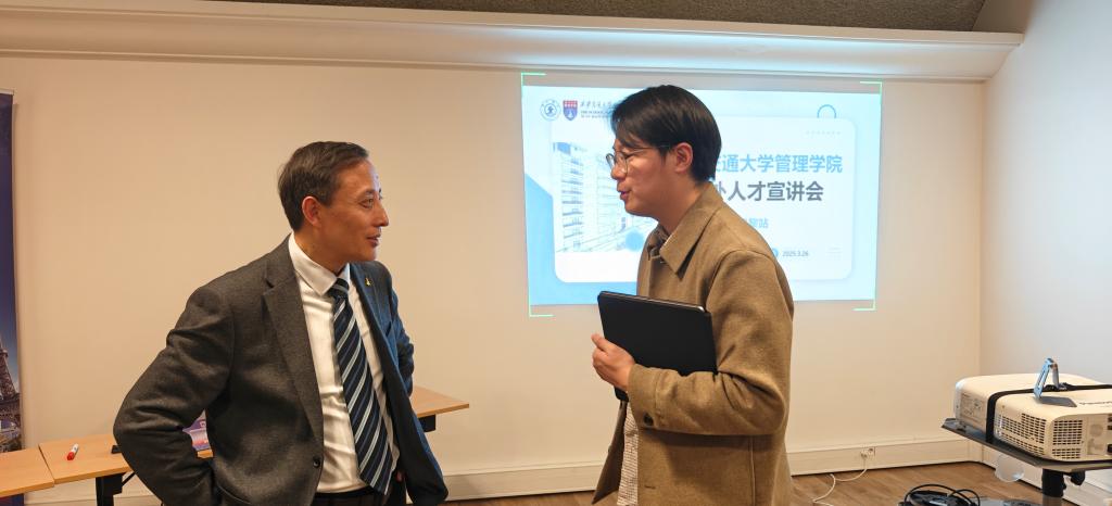 代表团在巴黎举办了主题为“交大相邀 管院筑梦 融汇东西 共创一流”的人才招聘宣介会。宣介会通过线上线下同步进行的形式,吸引了近 50 位青年学者积极参会。马晓彬介绍了校院历史、学科建设、人才培养、科学研究及国际合作情况,并解读了学院的人才政策和职业发展通道,展示了学院汇聚全球优秀人才的诚意和决心。教师代表房超教授、刘野逸教授结合教学科研成长经历,分享了宝贵经验,并鼓励求职者积极投身教育事业。人事秘书王钰为求职者答疑解惑,对求职者关于招聘流程、福利待遇等实际问题进行耐心解答说明。