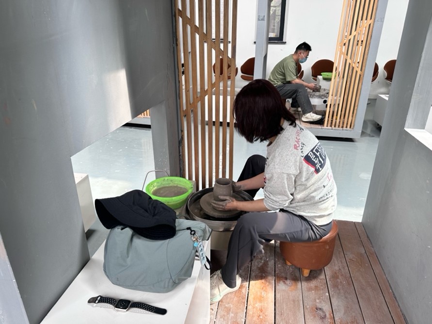 在拉坯体验项目中,师生们双手与陶土亲密接触,在拉坯机的旋转中感受泥土在指尖的流动与塑形。通过控制转盘速度与力度,将创意转化为器型,体会“泥随手动、心手合一”的传统技艺。