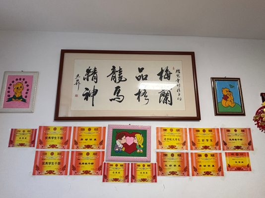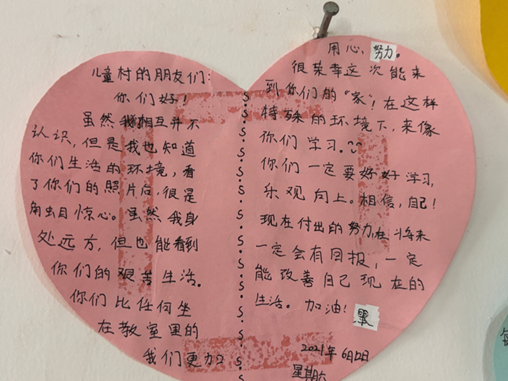 报告厅的墙上贴满了来自其他同龄小朋友们的祝福卡片,稚嫩的笔迹中流露着对“太阳村”的真挚祝福。随后,在负责人的带领下,党员和志愿者们参观了学生宿舍:孩子们的内务整理得井井有条,墙上贴满了奖状和自制的“卫生分配表”,展现了他们独立自律的生活态度。尽管生活条件有限,但孩子们的脸上始终洋溢着纯真的笑容,见到志愿者时热情问好,就像小太阳一样,给志愿者的心里带来一抹阳光。在餐厅的墙上,一张孩子们集体敬礼的照片格外引人注目,传递出他们对生活的热爱和对未来的憧憬。