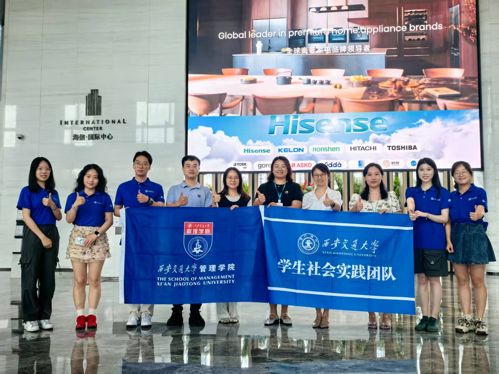 实践团队首站抵达位于青岛的海信国际中心总部大厦,受到海信集团财务部高层的热情接待。在品牌展厅内,师生通过交互式沙盘与样机陈列,全景式回溯了海信从本土代工到全球布局的出海历程。在随后的座谈会中,企业方系统阐释了“技术立企、品牌先行”的国际化战略,特别分享在海外研发中心与体育营销上的投入如何反哺人才梯队。叶宁副书记则介绍了交大“扎根西部、服务国家”的传统,并就联合课题、实习基地等合作展开畅想,双方就产学研深度合作达成共识。