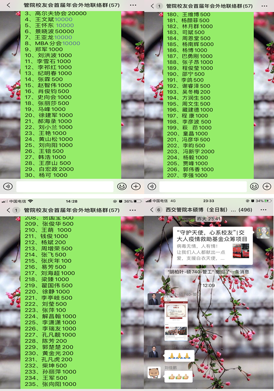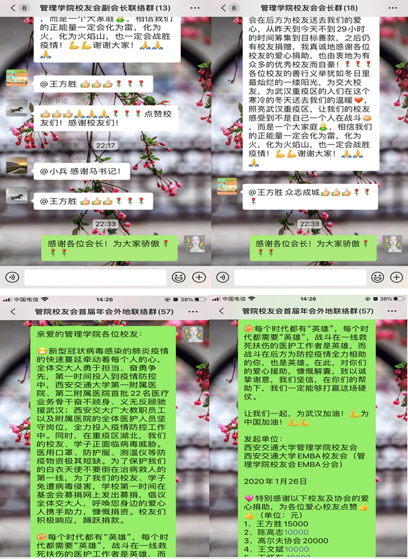 各位老师和校友们的善行义举犹如冬日里最灿烂的一缕阳光,为武汉重疫区的人们在这个寒冷的冬天送去我们的温暖,让我们的校友、我们的同胞感受到不是自己一个人在战斗,而是一个大家庭,相信我们的正能量一定会化为雷、化为火,一定会战胜疫情!