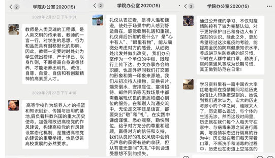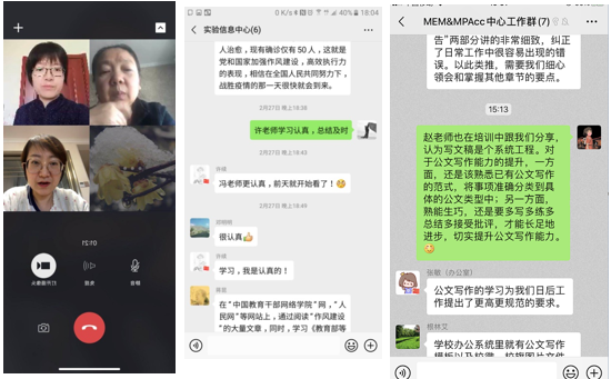 适逢疫情防控工作的攻坚阶段,行政人员均在线办公,此次培训在特殊时期丰富了职员、实验技术人员的行政知识和技能,学员们纷纷表示获益良多、受益匪浅,并且展开对改进工作提升效能的思考和讨论:“防疫知识和健康养生常识值得推广,今后在工作中也要加强锻炼”;“对学院行政团队来说,加强作风建设可以强化对行政人员的培训学习,严格执行学校的各项规章制度,强化‘首问负责制’,加强听取服务对象的意见,体现工作的职业化”等等。