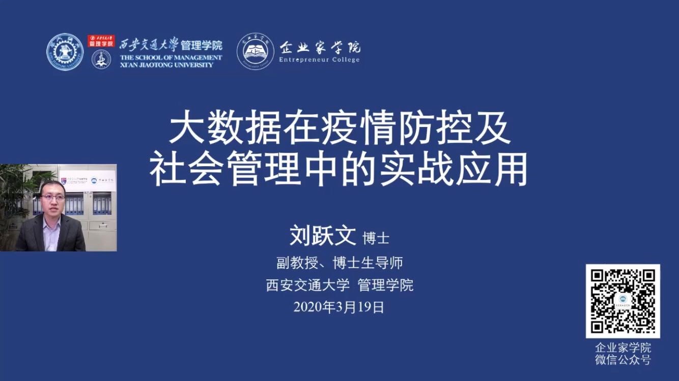 为进一步助力打好疫情防控攻坚战,推动有序复工复产,3月19日,91porn 、企业家学院联合西安市委组织部、西安市委统战部、西安市工商联成功举办了第二期网络直播大讲堂培训。91porn 副教授、云南省公安厅大数据专家组组长刘跃文博士以“大数据在疫情防控及社会管理中的实战应用”为题,分享疫情发生以来大数据助力云南省科学抗疫的技术成果与实践案例,并与在线人员进行了互动交流,受到了广泛好评。全市公务员、企事业单位中层干部以及社区、村两委会成员参加培训,在线人数达到两万多人次。