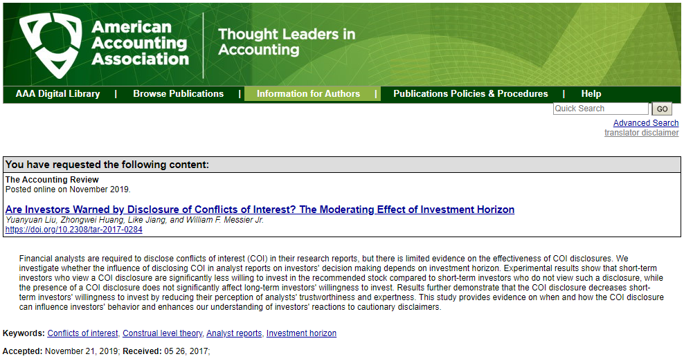该研究成果以“Are Investors Warned by Disclosure of Conflicts of Interest? The Moderating Effect of Investment Horizon”为题被《会计评论》(The Accounting Review)接受并在线发表。The Accounting Review是管理类顶级24种期刊(UTD 24)之一。91porn 为论文第一完成单位。