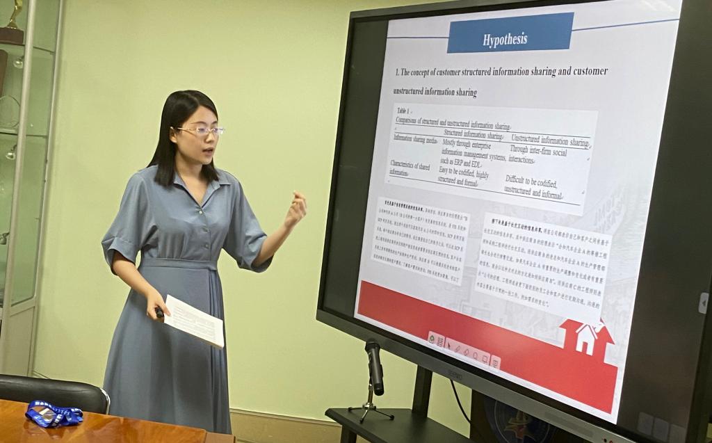 李丝雨老师的报告主要关注制造商和客户之间的信息共享活动,提出、区分两类客户信息共享实践:客户结构化信息共享和客户非结构化信息共享。她提出应从一个更加平衡、全面的视角看待驱动客户信息共享实践的前因:即同时考虑其社会前因-客户关系承诺,和技术前因-客户信息系统连接。通过收集410家中国大陆制造商的问卷数据,研究发现,客户关系承诺和客户信息系统连接都会正向影响客户结构化和非结构化信息共享。该研究基于信息处理理论,在客户关系不确定的情境下看两种信息共享实践对供应链绩效的不同影响,得出客户需求不确定性负向调节结构化信息共享-供应链绩效之间的关系,正向调节非结构化信息共享-供应链绩效之间的关系。