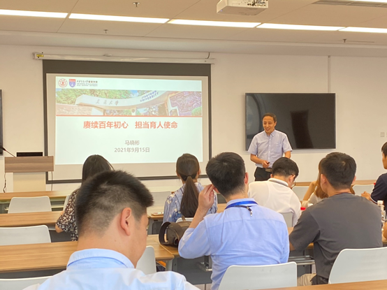 下午的培训会的第三版块在创新港管理研究院举办。学院党委书记马晓彬做“赓续百年初心 担当育人使命”的师德教育主题报告。马书记从国家、学校不同层面阐释了立德树人的重要意义。特别是青年教师们要从入职的第一天起就明确任务、树立目标、坚定思想、勤下功夫、克服困难,担负起为党为国育才的初心使命,共同创造学院的新辉煌。