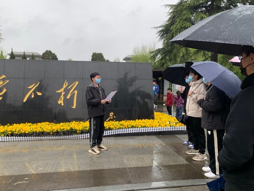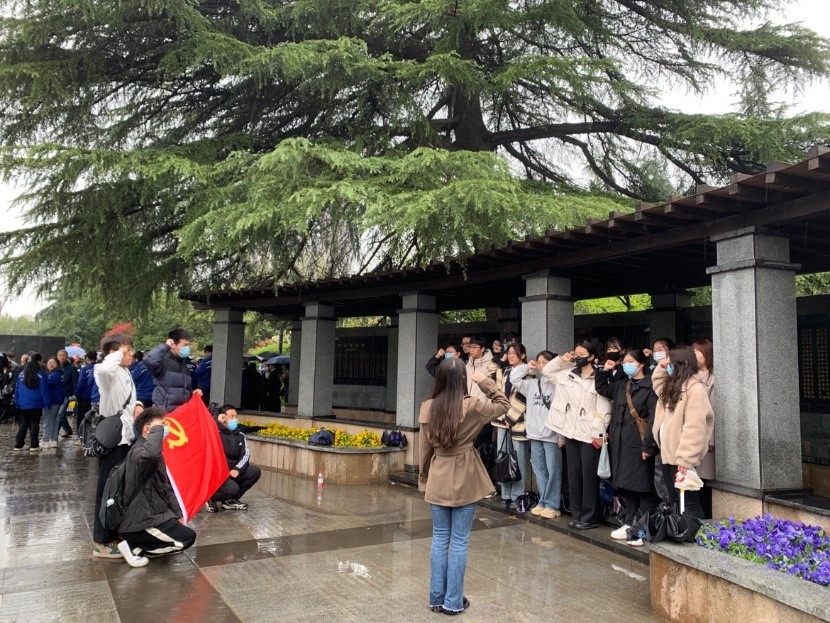 在烈士纪念亭前,党员同志们见到了石碑上一个个令人敬仰的姓名,每位同志都为烈士们致以沉痛的哀悼。在2022级专业学位硕士支部书记段文婧的带领下,各支部同志一起重温了入党誓词,宣誓声振聋发聩,以爱国爱党的浓烈情绪感染了同访的社会人士。