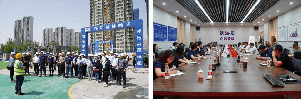 作为全球领先的太阳能科技公司,隆基绿能可以提供从行业到户用、从电站到氢能的定制化创新性绿色新能源方案。在专业讲解员的带领下,师生代表共同参观了隆基绿能智慧能源展览馆和光伏车棚,深入了解了该企业的发展历程、品牌文化、产品技术、市场战略等内容。随后两校师生前往西安幸福林带项目参观,从展览厅了解到,该项目是全球最大的地下空间利用工程之一、全国最大的城市林带工程、陕西省重点工程,也是西安市最大的市政工程、生态工程和民生工程,被誉为“世纪工程”,总投资约240亿元。通过讲解员的细心讲解以及中建丝路城市综合开发运营商事业部助理总经理李明印的详细解答,两校MEM学生对该项目有了更加全面深入的了解与思考。下午两校师生奔赴陕建三殿村城市更新项目参观交流。该项目占地256亩,规划建设安置楼36栋,其规划建设融入了智慧社区概念及元素。在现场工作人员的带领与讲解下,师生对扬尘治理亮点、工程实体细部做法、智慧工地建设等进行了现场观摩。陕建四建集团党委副书记、总经理宋轮航,陕建四建集团副总经理王长明和冯亚兵在座谈会中对同学们的提问给予耐心细致的解答,让大家对城市更新模式、相关创新技术有了更为深入的了解。作为西安市样板工程,“陕建三殿城市更新模式”为持续推动城市结构优化、功能完善程度和品质提升以及城市更新模式具有示范作用。
