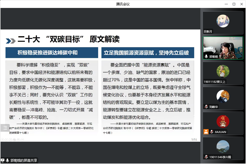 郭菊娥教授号召与会师生,要进一步深刻领会党的二十大精神,坚持四个面向,围绕国家碳达峰碳中和重大战略需求,切实承担起服务国家“双碳”战略目标的社会责任,开展卓有成效的基础研究、科技攻关、成果转化、人才培养、决策咨询等,与政府、企业协同行动,推动实现“双碳”战略目标。