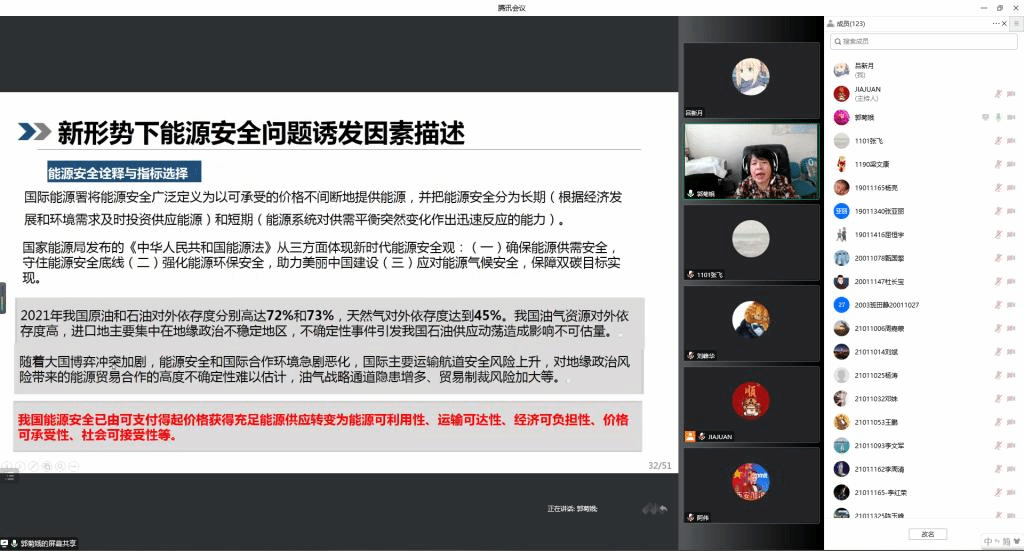 郭老师详细汇报了近年来其科研团队服务绿色发展和国家战略,助力实现“双碳”目标所开展的科研工作。通过对新形势下能源安全问题诱发因素描述及其影响机理的深入分析论证,揭示技术创新突破是实现双碳目标的关键。通过对国家能源安全发展价值评估的核心问题及其实现途径,国家电力供给安全面临的问题及其技术突破的模式创新,电力技术攻关及其碳排放技术优化策略等方面的介绍,使大家对二十大“双碳”目标下我国能源的安全保障问题有了更全面、更深刻的了解与认识,为接下来开展相关学术研究打下了良好的基础。