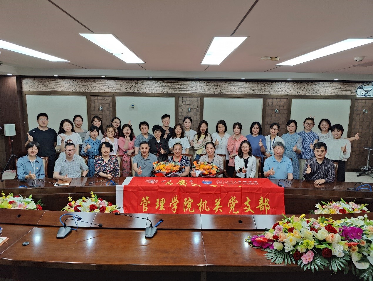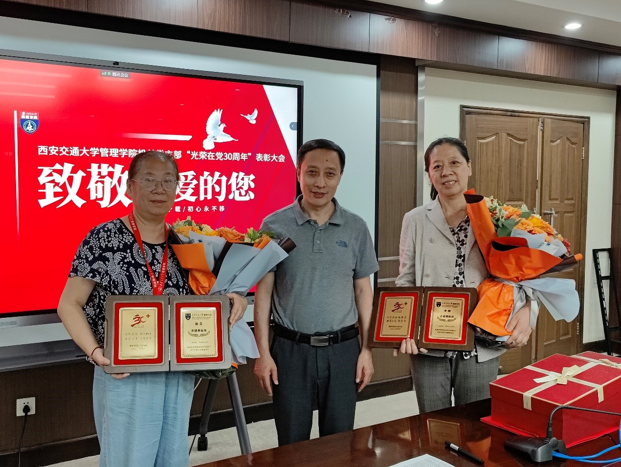 随后,机关党支部召开“光荣在党30周年”表彰大会。支部对MEM与MPAcc中心李静老师、实验与信息中心蒋昆老师进行了表彰。“风雨三十载,初心永不移”党委书记马晓彬为两位老师颁发了奖品和鲜花,表彰大会现场气氛热烈。两位老师回顾了在学院大家庭工作和学习的点点滴滴,表达了对学院和党支部的感谢,并寄语年轻党员们不断成长进步。相关部门主任和同事也为两位老师送上了美好的祝福。