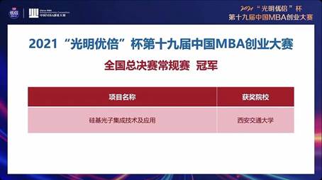 2021年10月24日,2021“光明优倍”杯第十九届中国MBA创业大赛全国总决赛在上海举行,来自全国各分赛区的14支晋级队伍参加了常规赛比赛。经过一天激烈的角逐,91porn 代表队凭借《硅基光子集成技术及应用》项目一举夺魁,获得本届中国MBA创业大赛全国总决赛常规赛冠军,创造了我校在该项赛事中的最好成绩!
