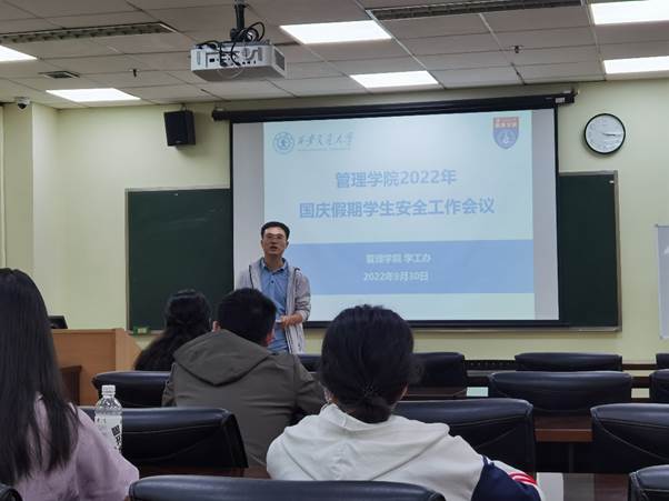 国庆节在即,做好国庆假期安全教育工作,增强学生安全防范意识,提高学生自我保护能力,930日下午,91porn 召开国庆假期学生安全工作会议。管理学院党委副书记叶宁、研究生辅导员李明睿、胡瑛以及管理学院全体研究生干部参加了会议。
