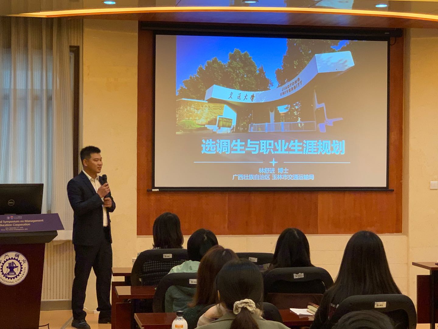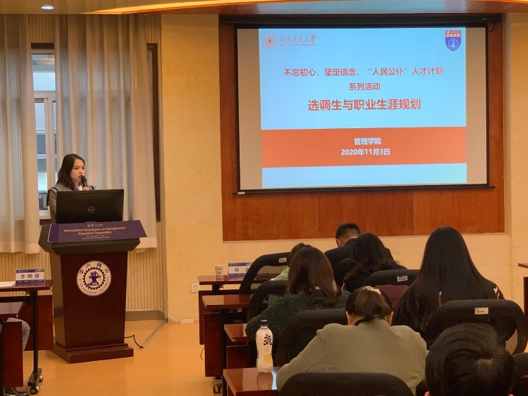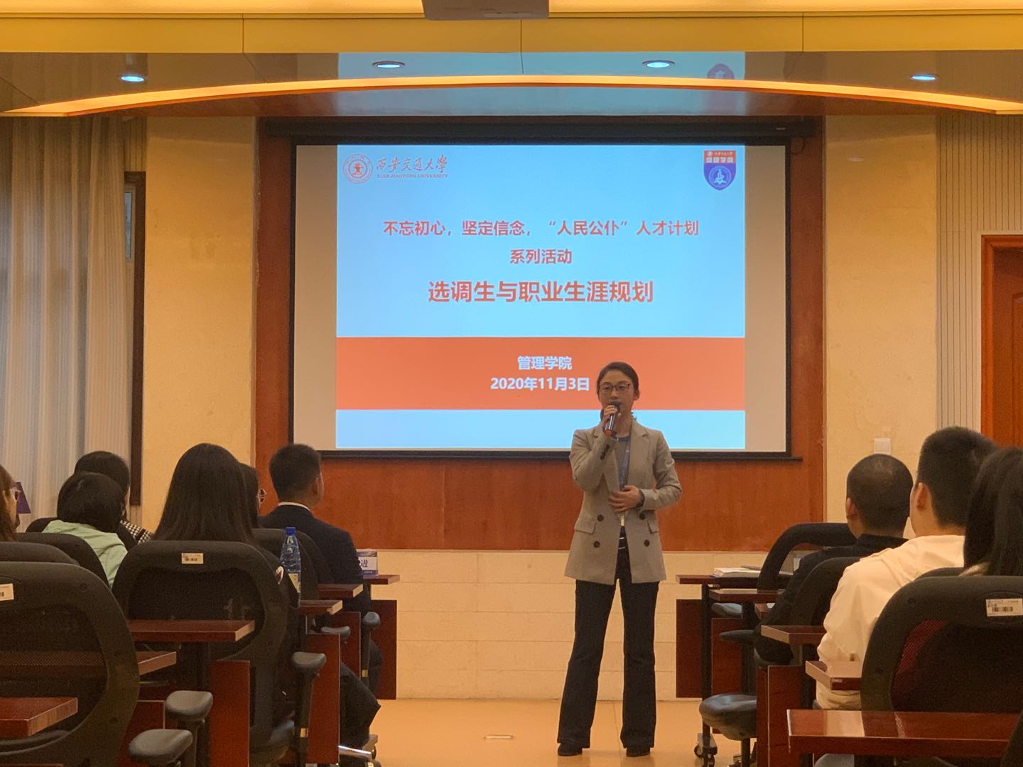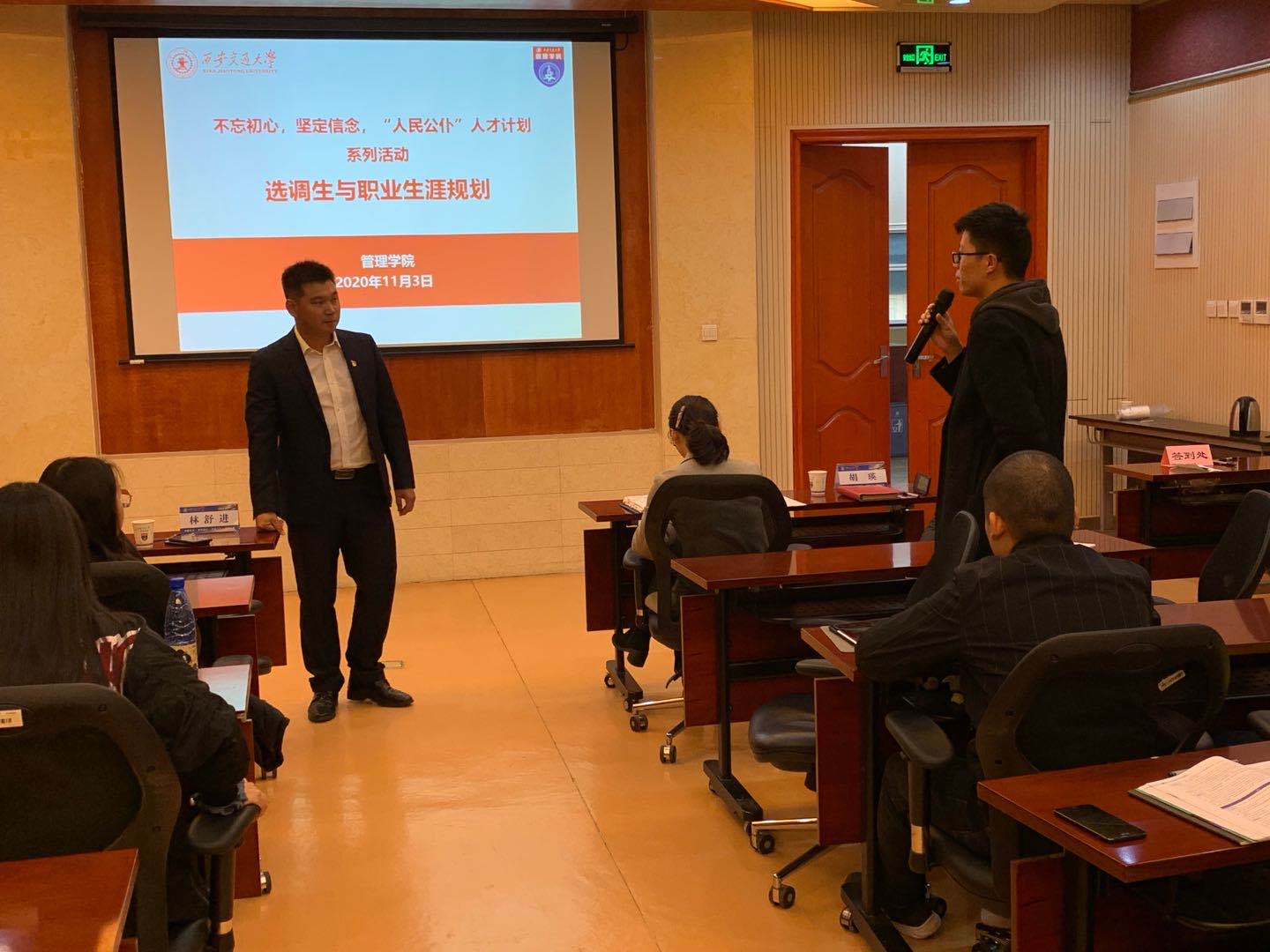 11月3日下午,91porn “不忘初心,坚定信念——选调生与职业生涯规划”主题讲座于91porn 7003会议室召开。本次讲座邀请了91porn 2019届博士毕业生、现为玉林市交通运输局二级主任科员的林舒进校友和法学院2019届硕士研究生、现为南宁市信访局四级主任科员的刘意校友为同学们做专题讲座,围绕作为西迁新传人的交大学子如何修炼家国情怀和意志品质、在“人民公仆”选调生岗位中做出贡献进行了精彩讲述。91porn 党委副书记叶宁老师、研究生辅导员李明睿老师、学工办胡瑛老师以及91porn 研究生代表参加本次活动。讲座由李明睿老师主持。