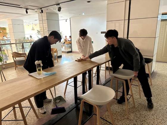 进行了学院清洁的志愿服务活动,通过具体的志愿服务活动来增强支部同学们的志愿服务意识和奉献精神。同学们对学院学生活动区等公共区域进行了清洁,主要包括清扫地面、擦拭摆放桌椅、给绿植浇水。经过同学们的努力,学院的环境变得更加干净整洁,同学们也通过实际行动,体会到了服务他人、奉献社会的快乐与满足感,加深了对奉献、友爱、互助、进步的志愿精神的理解。