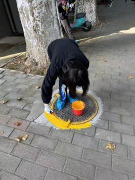 支部成员和积极分子来到校园马路上,对学校中的井盖进行粉刷,以便大家识别,避免行人不慎掉入井下或车辆不慎撞上井盖等危险事件发生。刷上的黄漆均匀、光滑、颜色鲜艳、不掉色,不影响井盖的正常使用和工作,同时避免弄脏周围环境。看到粉刷后的井盖变得清晰,知道这样做是为了大家的出行安全,每一位同学都心甘情愿地投入其中。