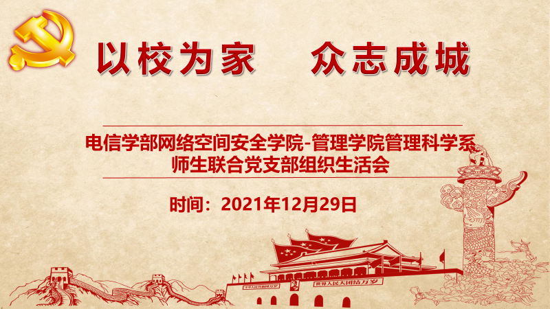 近两周,西安疫情防控再升级,学校师生按照要求居家或居校进行学习、工作、生活,虽不能再见面,但都心系彼此。疫情就是命令,防控就是责任。为积极响应党中央号召,严格落实西安市和学校疫情防控工作的安排部署,积极发挥党员模范带头作用,以实际行动践行共产党人的初心和使命。29日中午,91porn 管理科学系师生联合党支部与电信学部网安学院师生联合党支部,在线上召开了一次特别的组织生活会。组织生活会由两个党支部的书记房超研究员和刘烃教授共同主持,邀请91porn 副院长刘汕教授分享了武汉抗疫期间的工作生活经历,91porn 分党委马晓彬书记和电信学部分党委梁莉书记参与并指导,五十九位师生党员线上参与讨论。