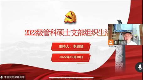 1016日至22日期间,中国共产党第二十次全国代表大会胜利召开。1030日,2022级管科硕士党支部以线上会议的方式召开专题组织生活会,学习二十大报告。本次会议由支部书记李恩贤同志主持,支部全体党员与积极分子参加了会议。