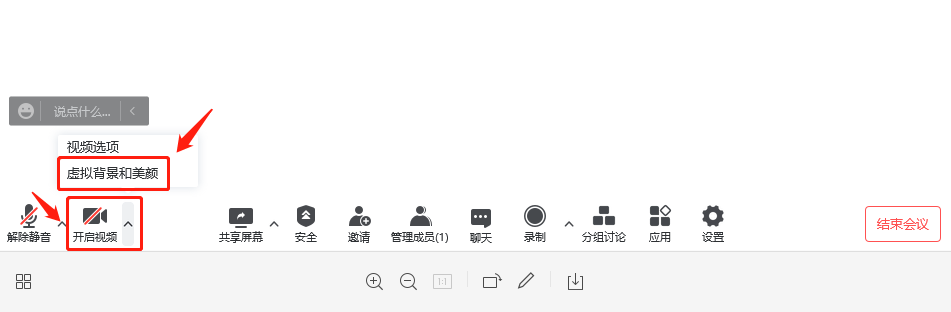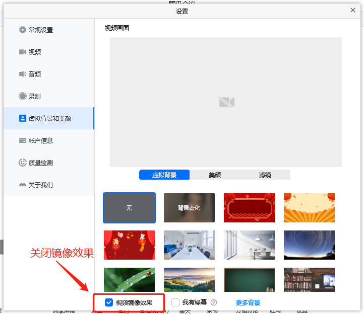 1、使用计算机参会时,点击会议软件下方“开启视频”的“虚拟背景和美颜”,关闭“视频镜像效果”,然后选择自己心仪的图片即可。