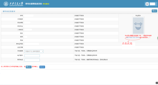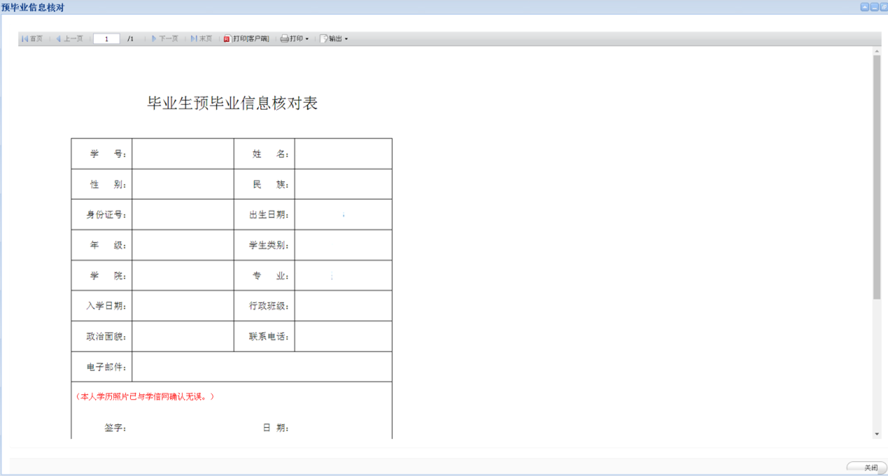 步骤6:回到预毕业信息核对界面,确认照片与学信网一致,补充不能为空的信息,点击“打印”按钮打印毕业生预毕业信息核对表。