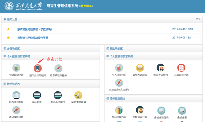步骤3:登录后,进入研究生管理信息系统(学生服务),点击“预毕业信息核对”。