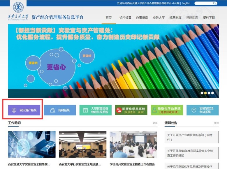用户通过统一身份认证登录“实验室与资产管理处主页(资产综合管理服务信息平台)”-“资产系统”。