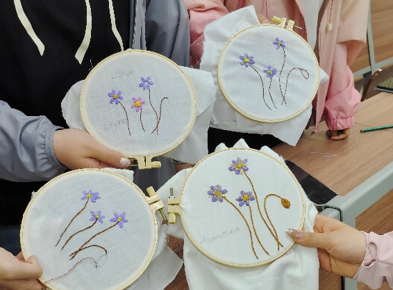 经过两个小时的努力,同学们的作品终于完成。大家满怀着自豪和喜悦,互相展示自己的作品。这些作品充满了春天的气息,可爱动人,富有生机与活力,仿佛一朵朵春日的花朵在绣布上绽放。