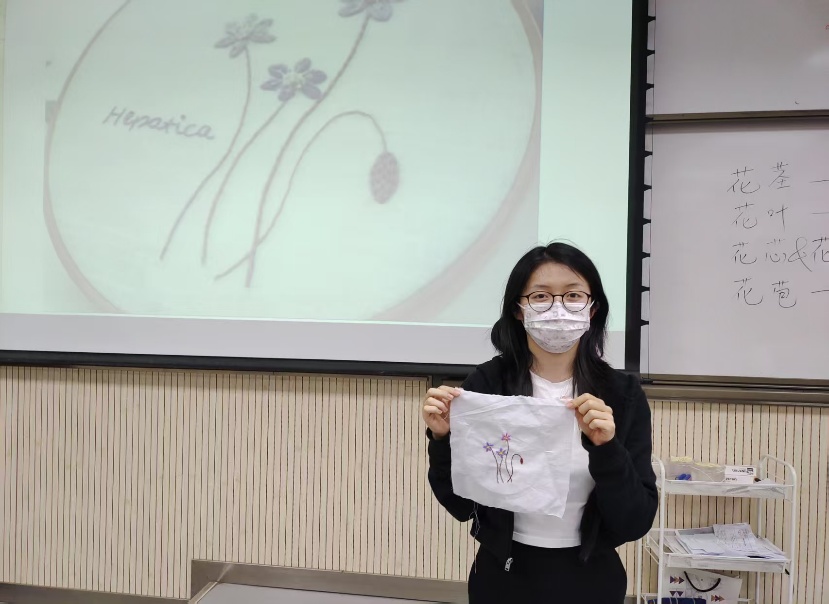 材料学院S3032班李馨然分享说:“以前总觉得刺绣是件很难的事,离我们的生活很遥远。没想到通过这堂课,我也能亲手绣出花朵图案,看着绣布上绽放的小花,特别有成就感!只要静下心来,慢慢琢磨,就能完成一件作品,原来静下心来这么重要!”