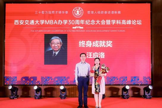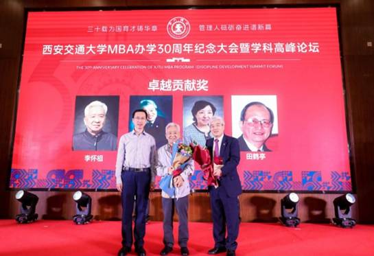 郑庆华副校长依次为获得MBA30周年终身成就奖的汪应洛教授和获得卓越贡献奖的李怀祖、席酉民、赵西萍、田鹤亭四位教授颁奖。
