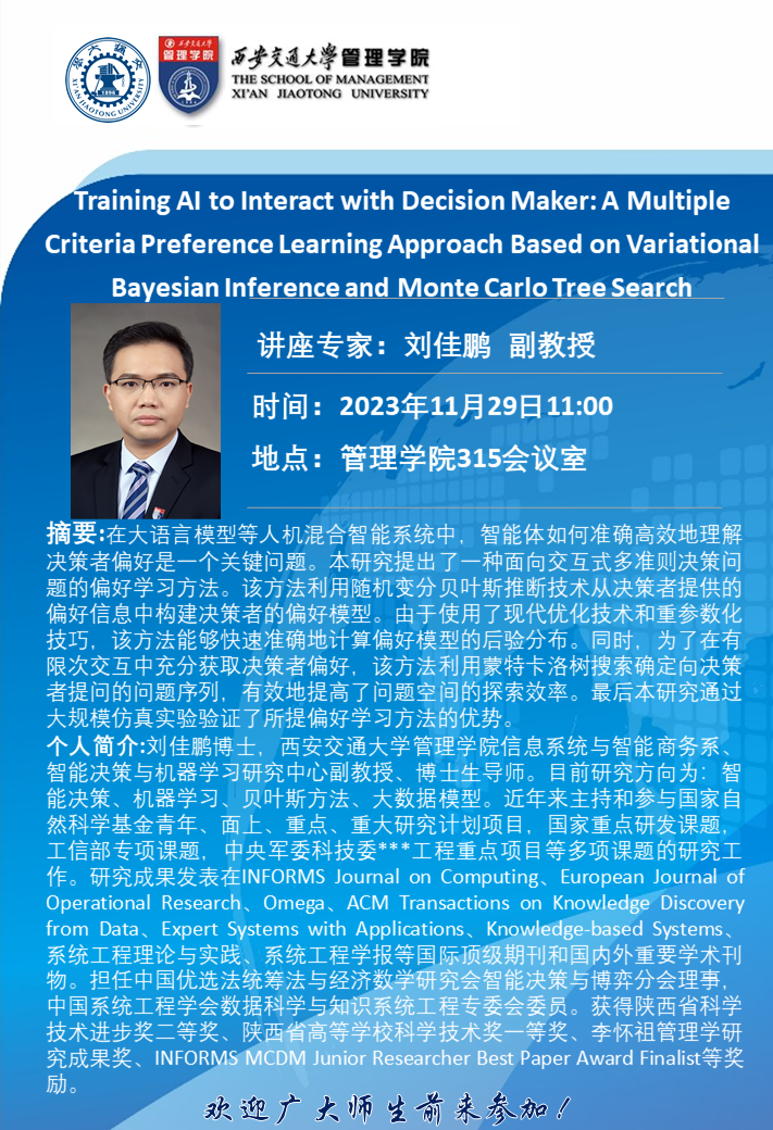 题目:Training AI to Interact with Decision Maker: A Multiple Criteria Preference Learning Approach Based on Variational Bayesian Inference and Monte Carlo Tree Search 2023-11-28