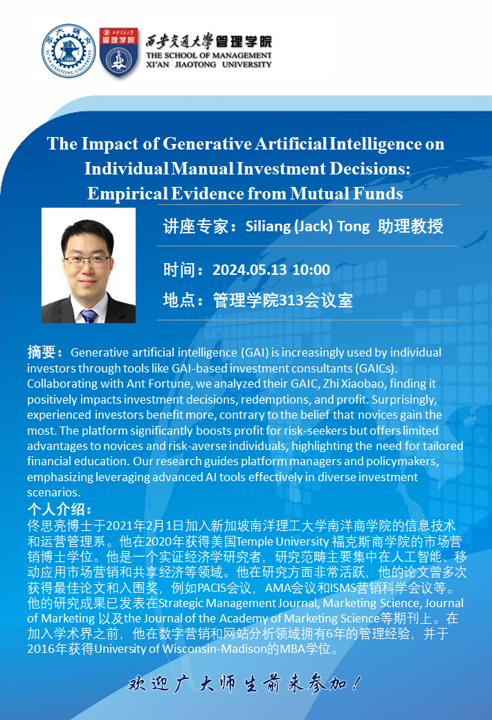 题目:The Impact of Generative Artificial Intelligence on Individual Manual Investment Decisions: Empirical Evidence from Mutual Funds 2024-05-08