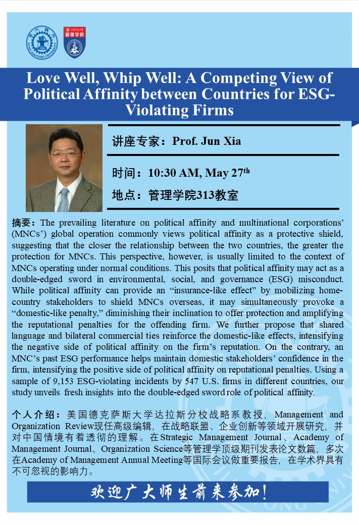 讲座:Lovw Well,Whip Well:A Competing View of Political Affinity between Countries for ESG-Violating Firms 2024-05-25