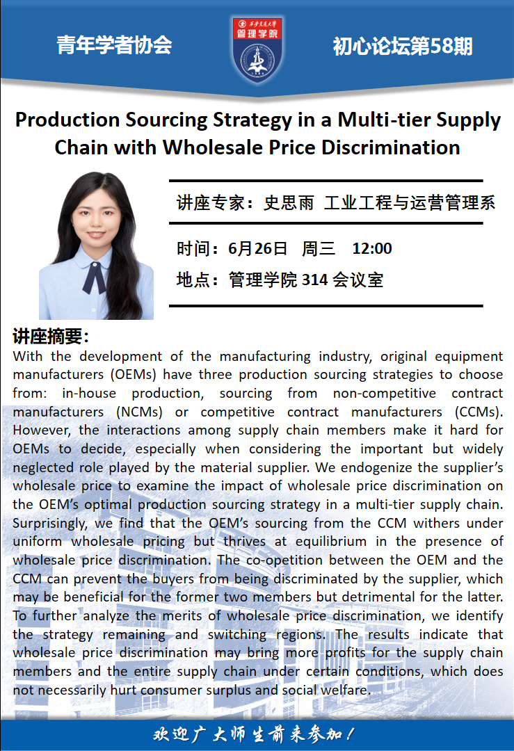 讲座:Production Sourcing Strategy in a Multi-tier Supply Chain with Wholesale Price Discrimination 2024-06-24