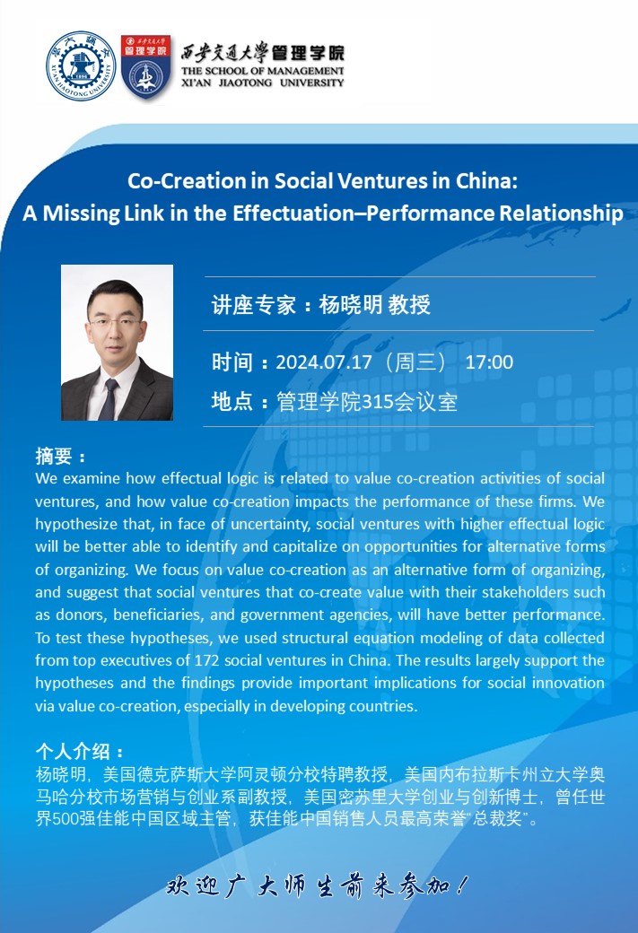 讲座:Co-Creation in Social Ventures in China: A Missing Link in the Effectuation–Performance Relationship 2024-07-16