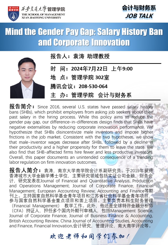 讲座:Mind the gender pay gap: Salary history ban and corporate innovation
