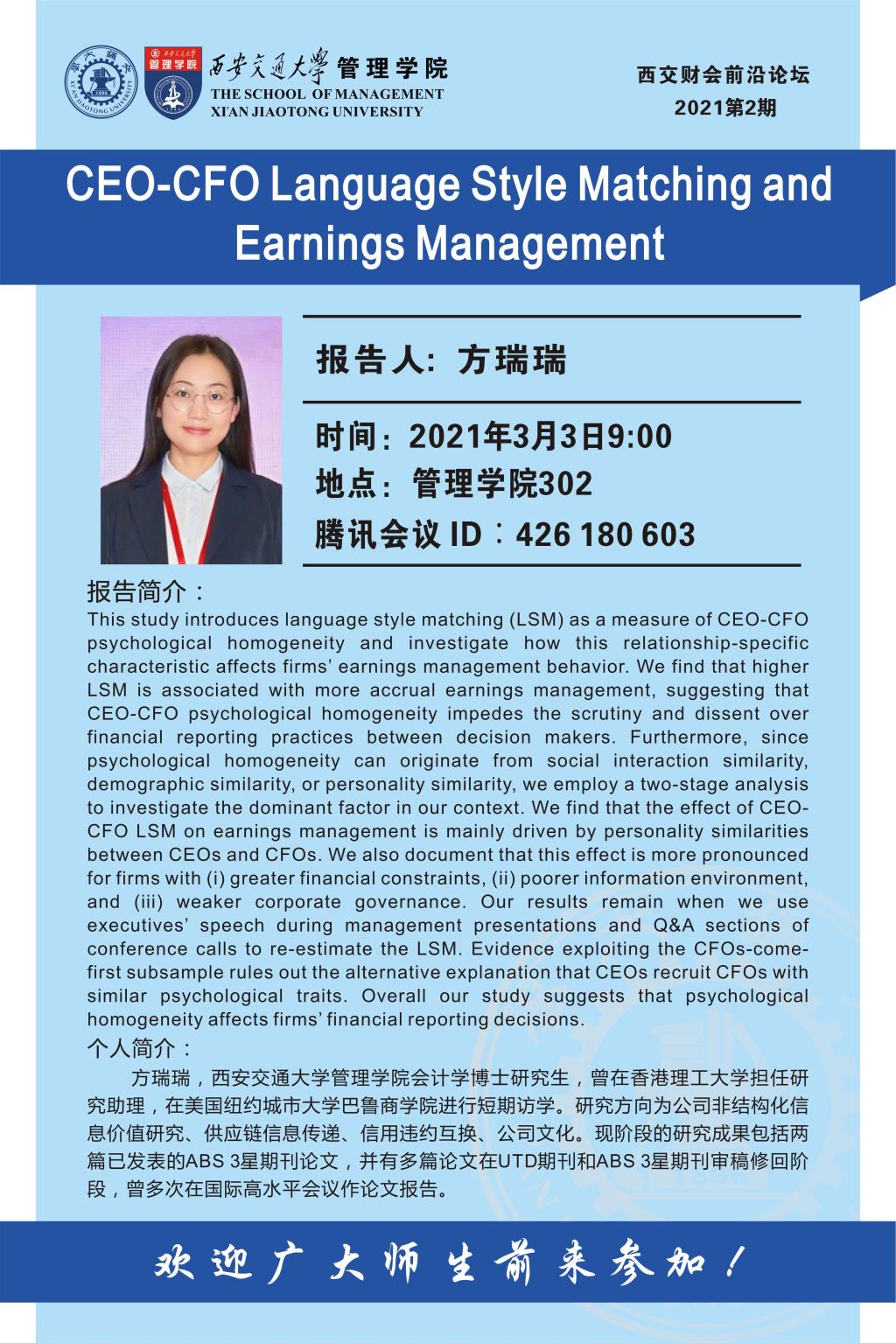 题目: CEO-CFO Language Style Matching and Earnings Management