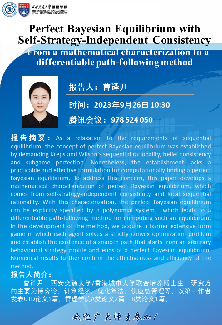 题目:Perfect Bayesian Equilibrium with Self-Strategy-Independent Consistency --From a mathematical characterization to a differentiable path-following method 2023-09-22