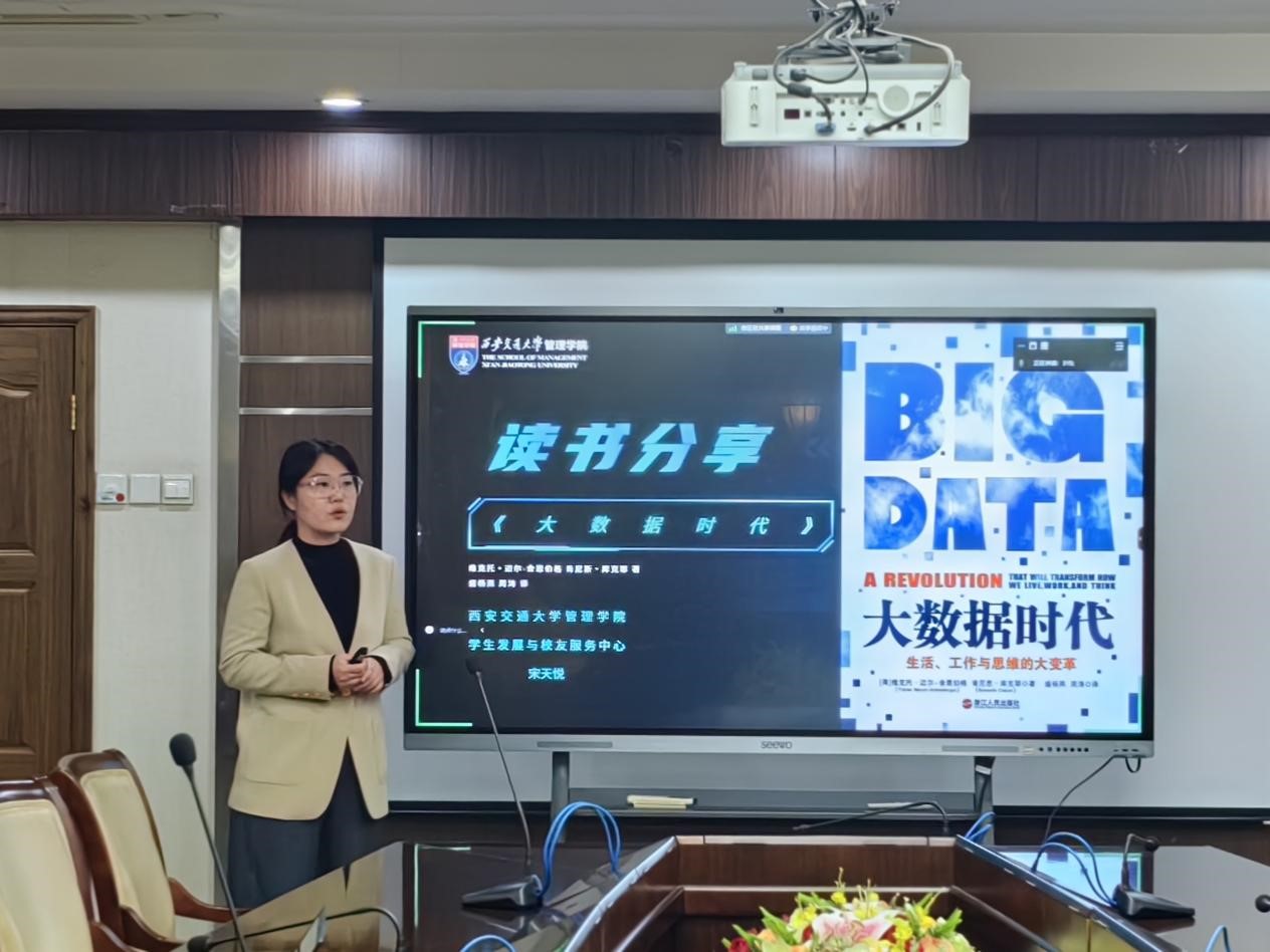 随后,入党积极分子、学生发展与校友服务中心宋天悦结合本次会议主题进行了《大数据时代》读书分享,讲解大数据时代的思维变革、商业模式的创新以及管理方式的演进,使大家对我国数据行业的发展现状以及“东数西算”工程有了更为直观的了解。