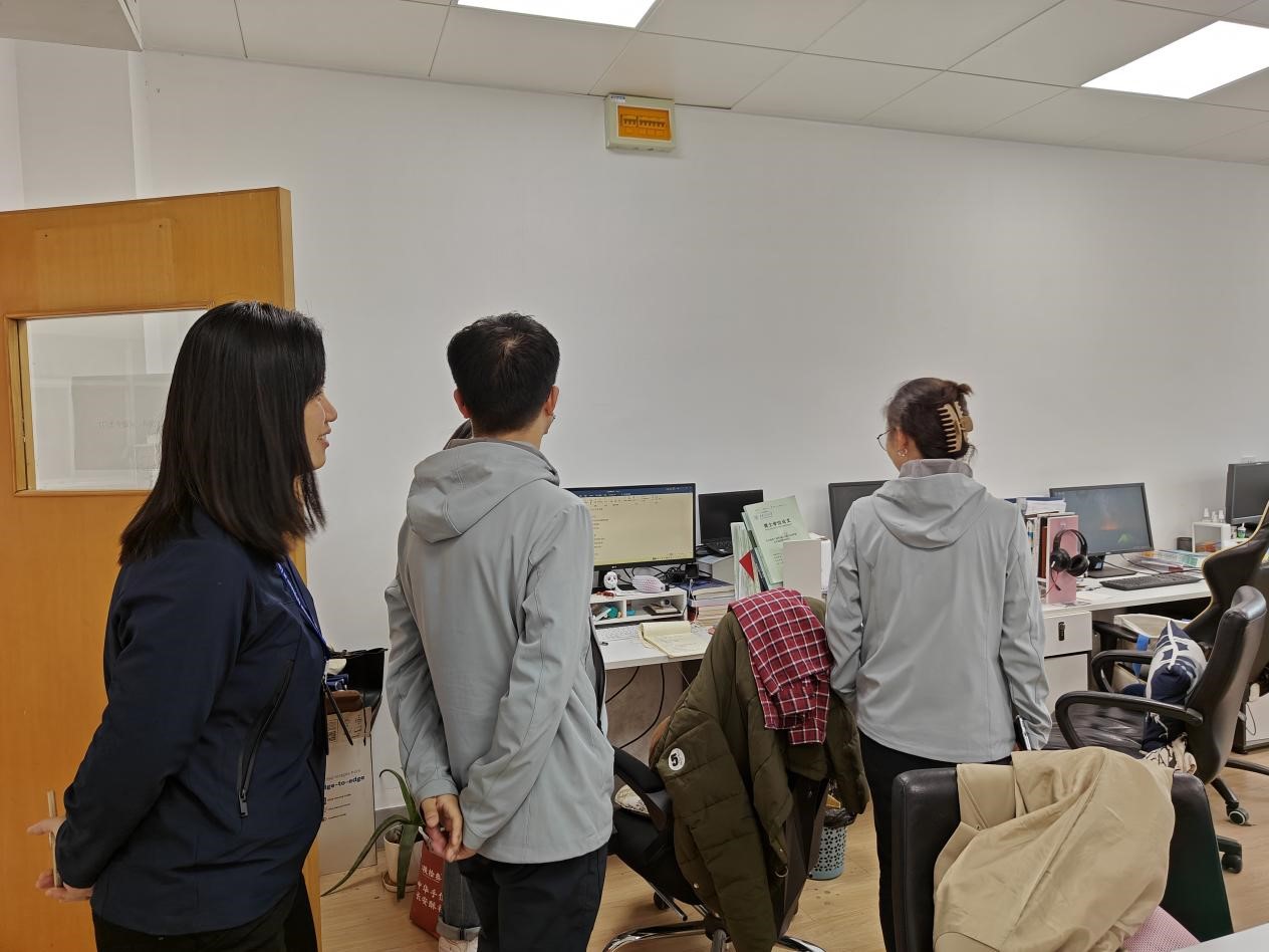 4月30日,叶宁老师、李明睿老师、胡瑛老师调研走访学生工位和宿舍,考察节前校园安全情况,检查宿舍工位环境卫生,排查违规用电、电线乱拉、电源线老化等潜在安全隐患,并与同学们亲切交谈学业和生活状况。